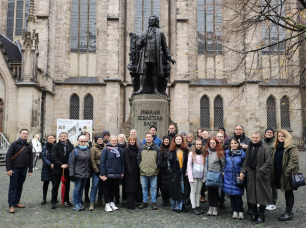 Die Zeitzeugen, Elke Urban und Albrecht Kaul, nahmen uns mit auf eine persönliche Zeitreise und erzählten von der dichten Atmosphäre der entscheidenden Tage im Oktober 1989 und von dem Mut der Menschen in der DDR. Die Stasi-Akte von Albrecht Kaul und die kreativen Methoden, mit denen man in der evangelischen Jugendarbeit die Verbote der Stasi umging, waren sehr beeindruckend. Während des Unterrichts „Zivilcourage – Heimatkunde 1985“ im Schulmuseum konnten wir am eigenen Leib erleben, wie schwer es fiel zu widersprechen. An dieser Stelle muss die hervorragende schauspielerische Leistung von Frau Dannemann alias Frau Müller, der Lehrerin, die ihre Klasse auf die Mitgliedschaft bei den Thälmann-Pionieren vorbereitete, gewürdigt werden. Die Eindrücke aus dem Schulmuseum führten zu einem intensiven Austausch zwischen den Teilnehmenden aus Deutschland und aus Polen, es wurden die Ähnlichkeiten und Unterschiede der jeweiligen Schulsysteme im historischen Rückblick ausgearbeitet. Mit dem Besuch des Friedensgebetes in der Nikolaikirche endete der historische Teil des Workshops. Einen wunderbaren Übergang bildete ein Konzert des Akademischen Orchesters im Gewandhaus.