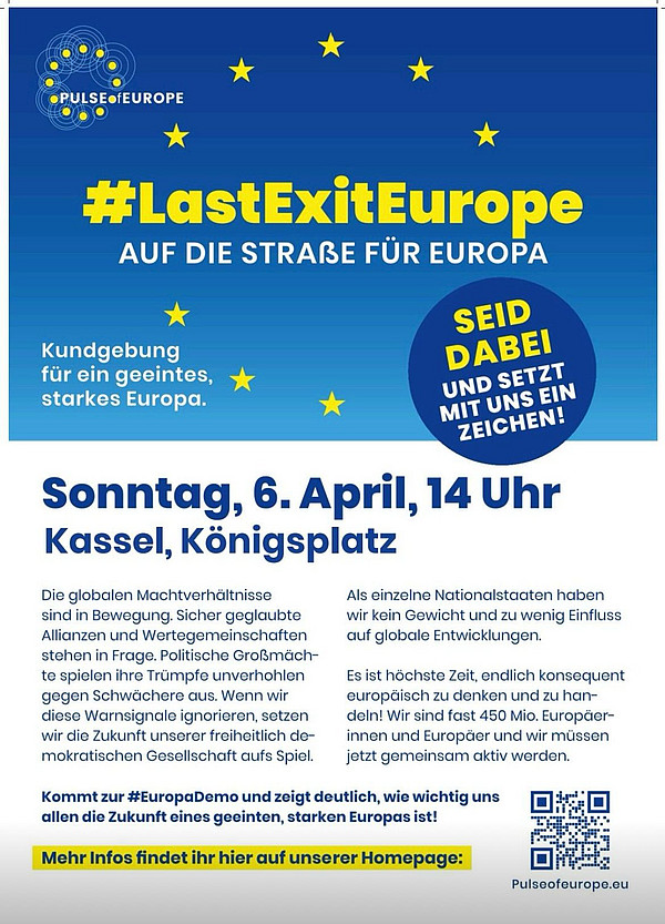 | 06.04.2025 | 14.00 | #LastExitEurope - Kundgebung für ein geeintes, starkes Euorpa | Kassel, Königsplatz |