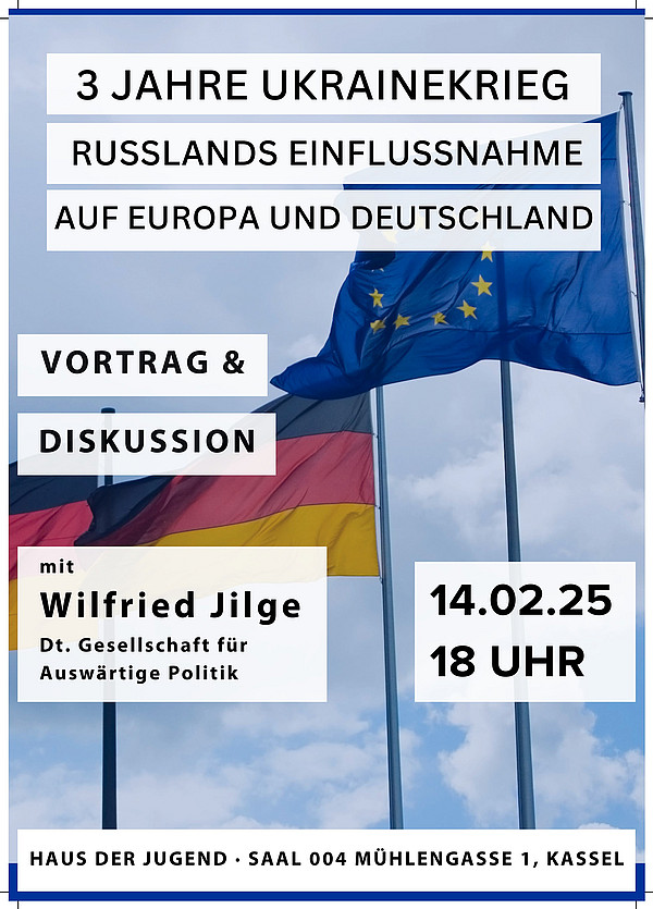 | 14.02.2025 | 18.00 | Russlands Einflussnahme auf Europa und Deutschland | Haus der Jugend, Saal 004, Mühlengasse 1, 34125 Kassel |