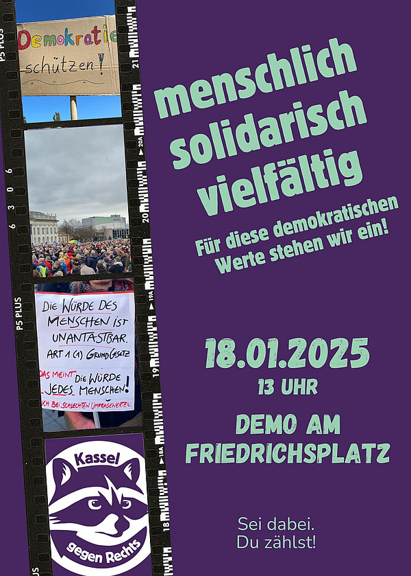 | 18.01.2025 | 13.00 | menschlich, solidarisch, vielfältig für diese demokratischen Grundsätze stehen wir ein! | Friedrichsplatz Kassel |