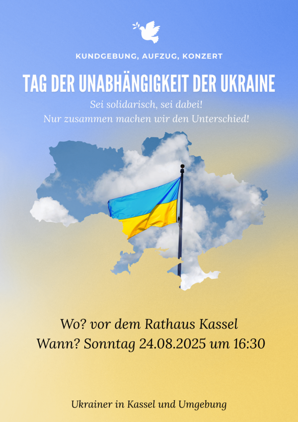 | 24.08.2025 | folgt | Ukrainischer Unabhängigkeitstag: Kundgebung, ein Aufzug durch die Innenstadt und ein abschließedes Konzert am Opernplatz | Beginn: Rathaus Kassel |