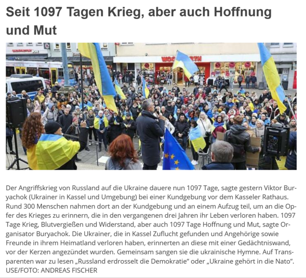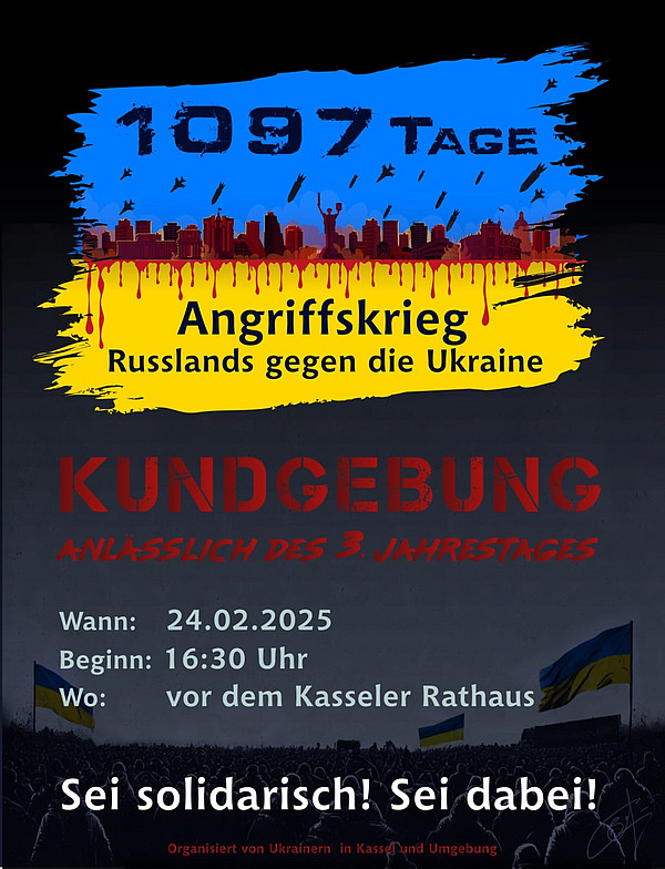 | 24.02.2025 | 16.30 | Kundgebung anlässlich des 3. Jahrestages des Angriffskrieges Russlands gegen die Ukraine | Rathaus, Kassel |