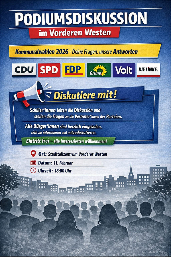 | 11.02.2026 | 18.00 | Podium zur Kommunalwahl | Stadtteilzentrum Vorderer Westen, Elfbuchenstraße 3, 34119 Kassel |