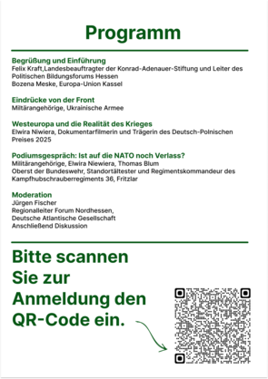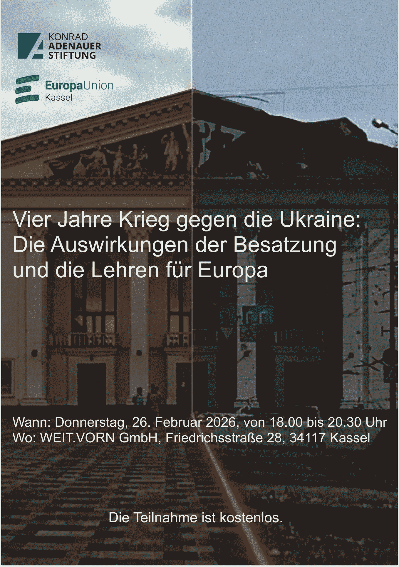 | 26.02.2026 | 18.00 | Vier Jahre Krieg gegen die Ukraine: Die Auswirkungen der Besatzung und die Lehren für Europa | WEIT.VORN, Friedrichsstraße 28, 34117 Kassel |